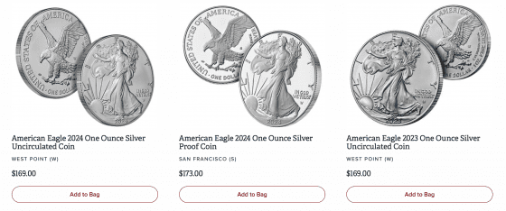 The Mint temporarily suspended silver sales earlier this week to implement the price changes. Products started coming back online yesterday with the new pricing. The 2024 Uncirculated Silver Eagle that retailed for $91 is now $169. The 2023 version also jumped to $169 from its previous $91 price point.