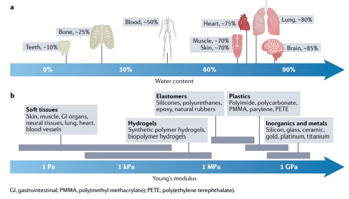 Furthermore, hydrogels with designed mechanical properties and chemical compositions have been shown to substantially enhance the biocompatibility of implantable devices by providing highly lubricious surfaces, reducing biofouling and alleviating foreign-body responses. This enhanced biocompatibility paves the way for various implantable devices to form long-term reliable and functional interfaces with the human body. Despite the great promise and recent advances in hydrogel interfaces, to the best of our knowledge, there is no systematic discussion on hydrogel interfaces for the merging of humans and machines. The literature on hydrogels as scaffolds for tissue engineering carriers for drug delivery and emerging materials for soft machines has been extensively reviewed, but existing reviews usually do not account for the applications of hydrogels as bridging interfaces between humans and machines nor do they provide the requirements or principles for the design of hydrogel interfaces.