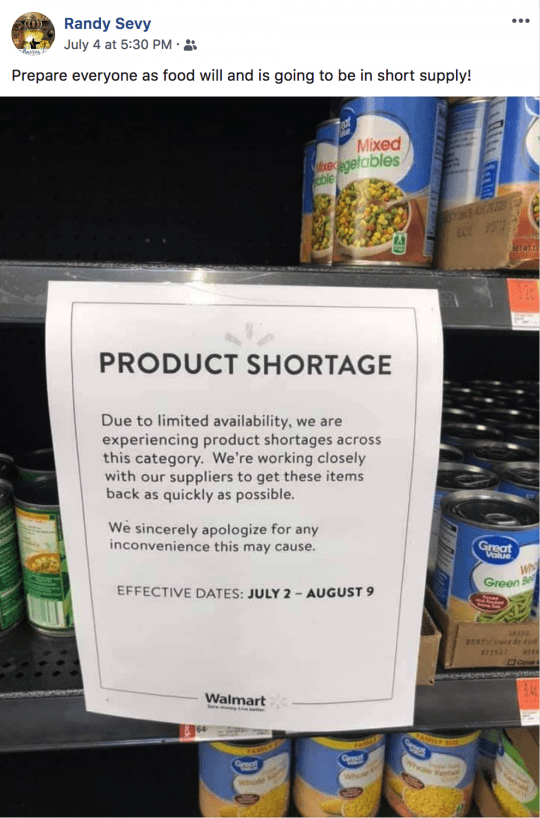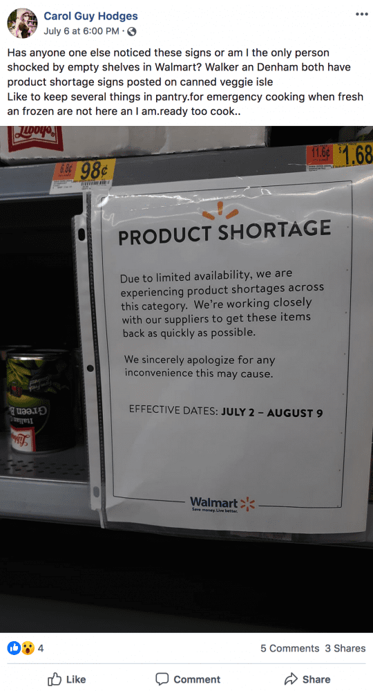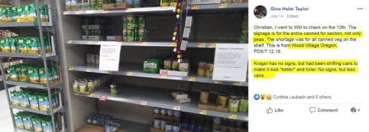 This first image was posted on Facebook by Scott L. Biddle, and it shows a “product shortage” notice that was posted in the canned vegetable section of a Wal-Mart in Tennessee…